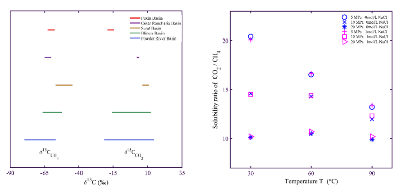 图2.典型微生物成因煤层气盆地中CH4与CO2碳同位素分布特征(左图)与不同温压范围内纯水与NaCl溶液中CO2与CH4溶解度比值(右图)。