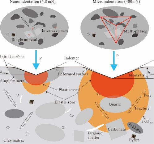 页岩力学性能的研究对页岩油气开发中压裂改造设计以及开展甜点评价具有重要意义。传统的单轴/三轴压缩试验宏观力学实验存在样品需求量大、测试周期长及样品不可回收等问题。且由于页岩的易碎性和弱层理面导致取芯困难,很难为优化压裂设计提供力学参数的连续解释剖面。因此,开发高效、简便且可靠的力学测试方法成为非常规油气领域的研究热点。近年来,微观力学测试在页岩中的应用受到了极大的关注,然而由于页岩具有很强的非均质性,通过微观力学测试准确获取并预测页岩的宏观力学行为并不容易,已经成为一个亟需解决的科学问题。