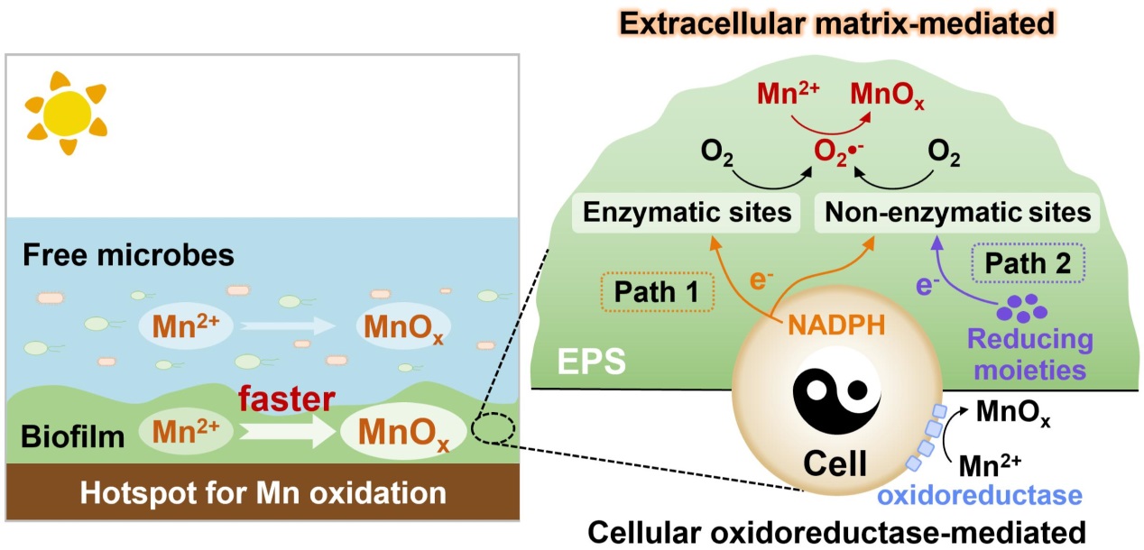 二价锰离子氧化形成的强氧化性锰矿物参与众多地球化学过程,环境中二价锰离子的氧化过程被认为主要由微生物细胞内的氧化还原酶驱动。本研究发现,水生生物膜因富含EPS,其单位细胞数量下的锰氧化能力可达游离微生物的2.9倍。这是由于EPS中的氧化还原活性组分能够介导胞内电子和胞外电子向氧气的传递,促进胞外O2•-的产生,从而快速驱动二价锰离子的氧化成矿。这种生物膜驱动的二价锰离子快速氧化过程在多种天然水生环境中得到验证。该项研究揭示了一种长期被忽略但广泛存在的二价锰离子氧化途径,拓展了关于微生物驱动锰及其他元素循环的理论框架。