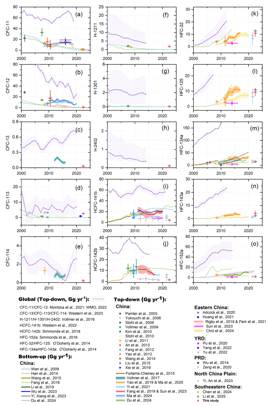 图3 中国东南部(2022-2023年)ODS和HFCs排放与前期研究的比较