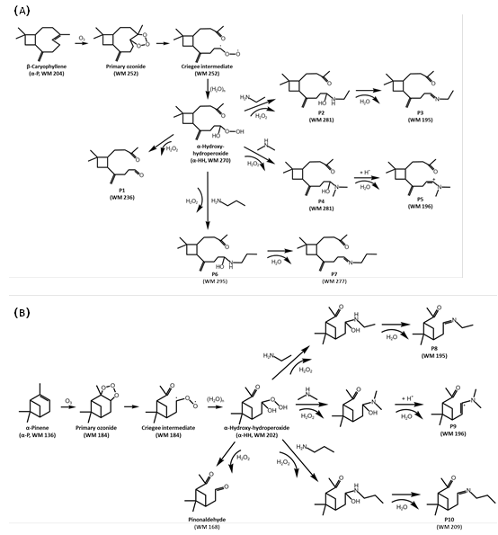 图3 (A)石竹烯和(B) α-蒎烯生成的α-HH与有机胺的反应路径