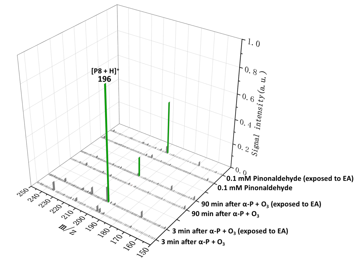 针对这一问题,先进环境装备与污染防治技术全国重点实验室王新明研究员和邱钧霆副研究员等,基于前期的用于气液界面的实验方法,系统研究了代表性的BOVC(α-蒎烯和石竹烯)生成的一类OP(α-hydroxyalkyl hydroperoxides, α-HH)和乙胺、丙胺、二甲胺等大气有机胺的界面化学反应。
