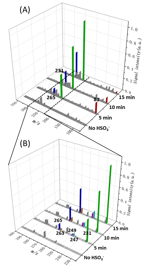 图1. α-P与SO2在AN/W(vol/vol = 1/1)中反应的结果。(A)在无HSO3⁻条件下以及加入HSO3⁻后5、10、15分钟的质谱记录;(B)在O2存在的条件下α-P与SO2反应产生的主要产物在m/z 225–300范围内的质谱分布。