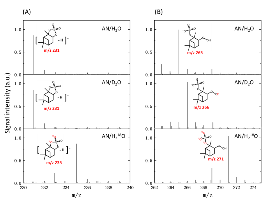 图2. 在 AN/H2O、AN/D2O和AN/H218O溶液中获得的质谱图:(A) m/z 231;(B) m/z 265。所有实验的体积比均为 1:1。