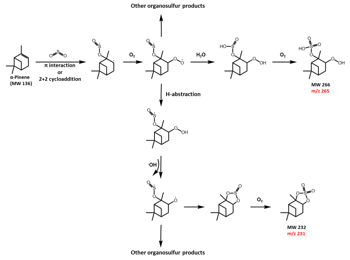 图3. α-P和SO2反应产物m/z 231 和 m/z 265 的可能生成路径