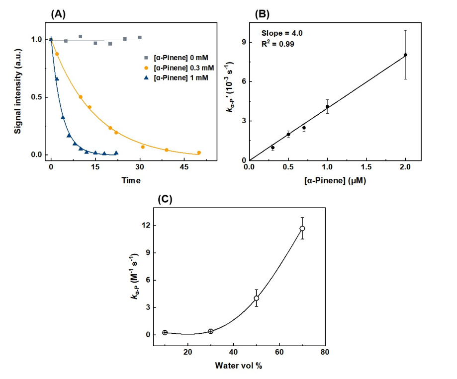 图4. α-P与SO2反应的动力学测量。(A)在不同α-P浓度下记录的HSO3⁻随时间变化信号所拟合的衰减曲线。m/z 81的曲线对应指数衰减 S = S0 exp(−k′ t),表示HSO3⁻信号的衰减;(B) 通过对kα-P′进行线性拟合计算得到α-P + SO2的二阶速率系数kα-P;(C) 在AN/W混合溶液中,α-P + SO2的kα-P随水体积分数的变化关系。误差棒来自至少3次重复实验。