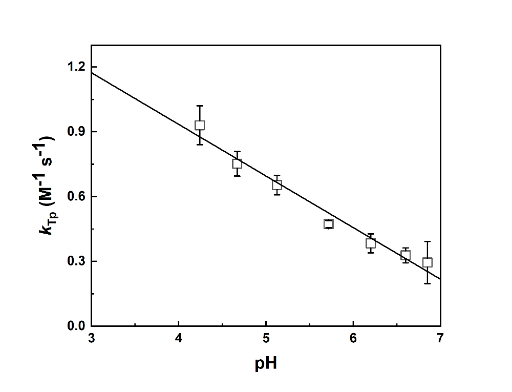 图5. 水溶液中α-萜品醇(α-Tp)与SO2反应的二阶速率系数kTp随pH的变化。误差棒来自至少3次重复实验。