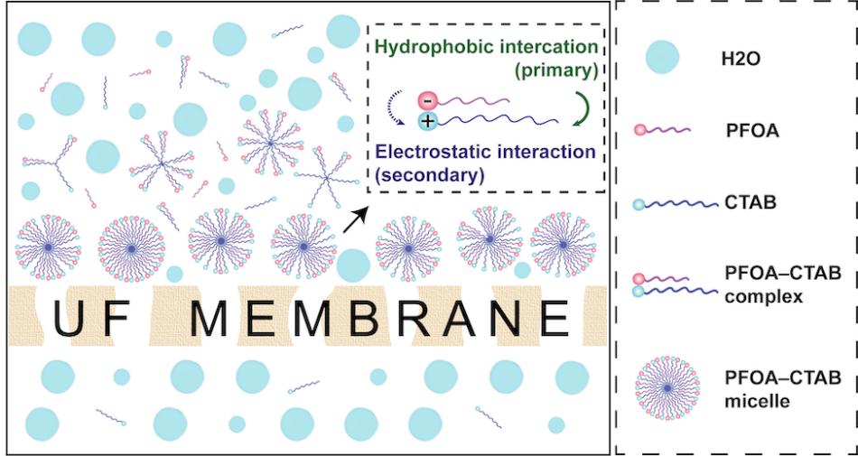 全氟和多氟烷基化合物(PFAS)因其高度的环境持久性和潜在健康风险,已成为全球广泛关注的新污染物。由于PFAS分子尺寸较小,传统膜分离技术在处理过程中往往面临能耗高、运行成本高等问题,亟需开发高效、经济的PFAS去除技术。针对上述挑战,研究团队构建了一种表面活性剂辅助的超滤(UF)体系,通过向含PFAS的水体中引入低浓度阳离子表面活性剂十六烷基三甲基溴化铵(CTAB),诱导PFAS分子与CTAB通过疏水相互作用和静电相互作用发生原位自组装,形成纳米尺度的胶束或复合物,从而显著提高PFAS在超滤膜上的截留效率。实验结果表明,加入CTAB后,PFOA的UF截留率由30.3% 提升至99.1%。该体系在不同过滤方式(包括死端过滤和错流过滤)、宽pH范围(1–9)以及存在天然有机质(NOM)等复杂条件下均表现出良好的截留性能,并可在长时间运行过程中保持运行稳定性。同时,该技术对其他部分PFAS及有机污染物同样具有良好的去除效果。结合实验与模型分析发现,膜过滤过程中产生的浓差极化效应会导致CTAB在膜表面局部富集,因此即使本体溶液中的CTAB浓度低于临界胶束浓度(CMC),在膜界面附近仍可形成CTAB–PFOA胶束与复合物,从而实现PFAS的高效截留。机理研究进一步表明,相较于静电相互作用,疏水相互作用在CTAB–PFOA复合物的形成及其PFAS的超滤截留过程中起主导作用。该研究构建了一种低压、低能耗的PFAS超滤截留技术,不仅深化了表面活性剂强化污染物截留机制的理解,也为PFAS污染水体的低能、高效处理提供了新思路。