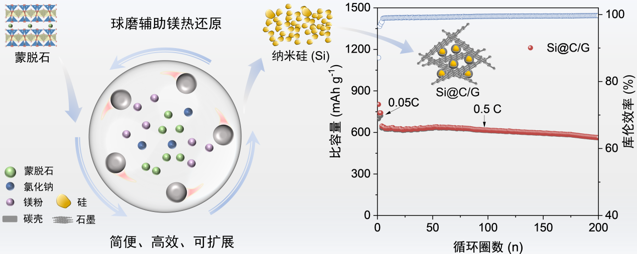 为此,先进环境装备与污染防治技术全国重点实验室朱润良研究员团队提出了一种简便、通用、可扩展的球磨辅助镁热还原策略,无需预处理和外源加热,通过机械球磨生热引发还原反应,直接将天然黏土矿物转化为多孔纳米硅。该策略具有以下特点:(1)高效简便。耦合机械球磨与镁热还原,极大提高了反应均匀性和能量效率;而且,极少量氯化钠(0.4当量)作为吸热剂就能有效抑制高温副产物(如镁铝尖晶石)形成,显著低于常规方法使用量(3~10当量)。(2)充分利用矿物结构。借助黏土矿物(如蒙脱石)固有的铝(氢)氧八面体结构,可以有效抑制纳米硅晶的聚集,同时通过自分解吸热,进一步降低体系温度,防止高温副产物出现。(3)普适性强。利用该策略拓展至其他黏土矿物(如高岭石、海泡石),均可成功制备纳米硅。(4)产物性能优异。所得纳米硅具有小晶粒尺寸(~26 nm)和多级孔结构,与石墨复合后的硅/碳复合负极材料表现出优异的电化学性能(初始库仑效率达87.1%,500次循环后容量保持率为71.1%)。该研究建立了将低成本黏土矿物转化为高价值纳米硅材料的简便途径,为我国黏土矿物高值化利用及锂电硅负极低成本制备提供了新思路。