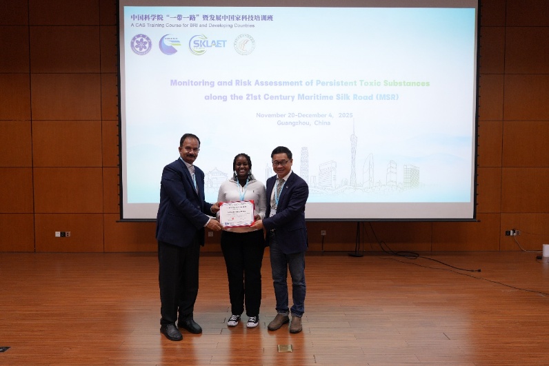 2025年12月4日,中国科学院广州地球化学研究所(以下简称广州地化所)主办的“一带一路”暨发展中国家科技培训班“21世纪海上丝绸之路持久性毒害污染物监测与风险评估”(Monitoring and Risk Assessment of Persistent Toxic Substances along the 21st Century Maritime Silk Road)在广州地化所举行了结业仪式。来自印度、巴基斯坦、孟加拉国、斯里兰卡、肯尼亚、加纳、泰国、越南、马来西亚、缅甸、埃塞俄比亚等12个国家的25名学员完成了培训课程并获颁结业证书。